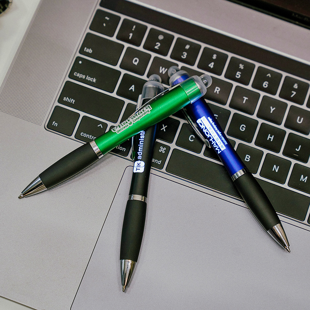 LED 觸控原子筆,由 ABS 塑膠、橡膠和金屬夾組合,一支筆集合多重功能和風格,送給不同人仕的贈品。