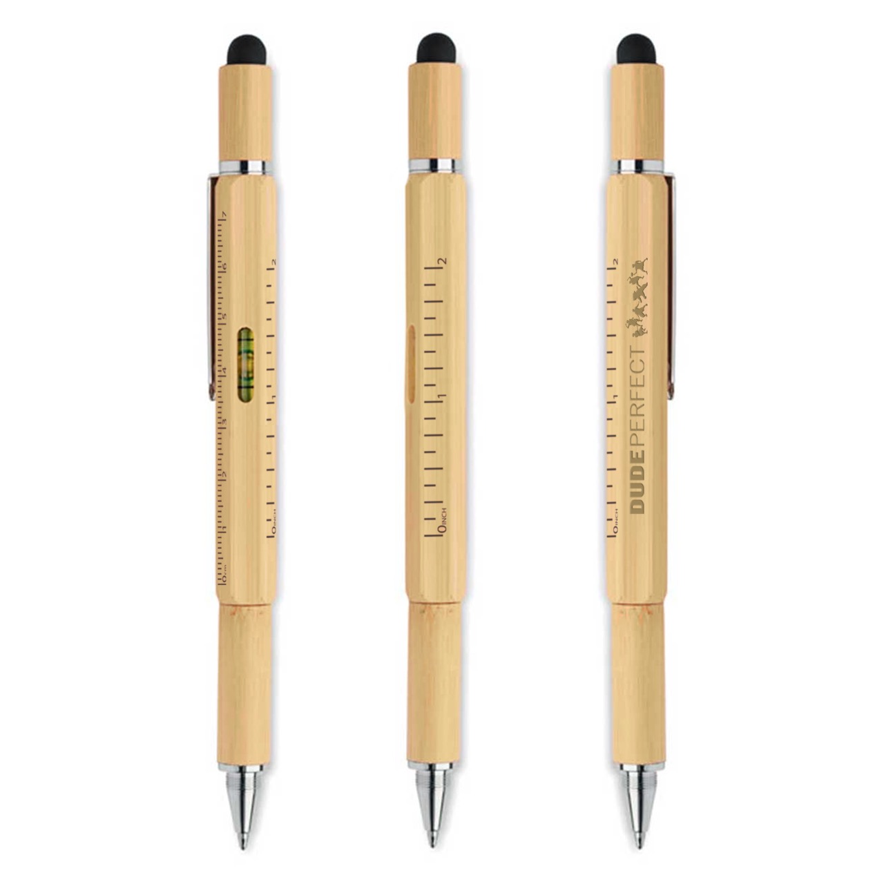 Twist action bamboo multi-tool pen with spirit level, rulers, screwdrivers, stylus. German ink, 1200m writing distance. Eco-conscious pocket essential for corporate gifts.