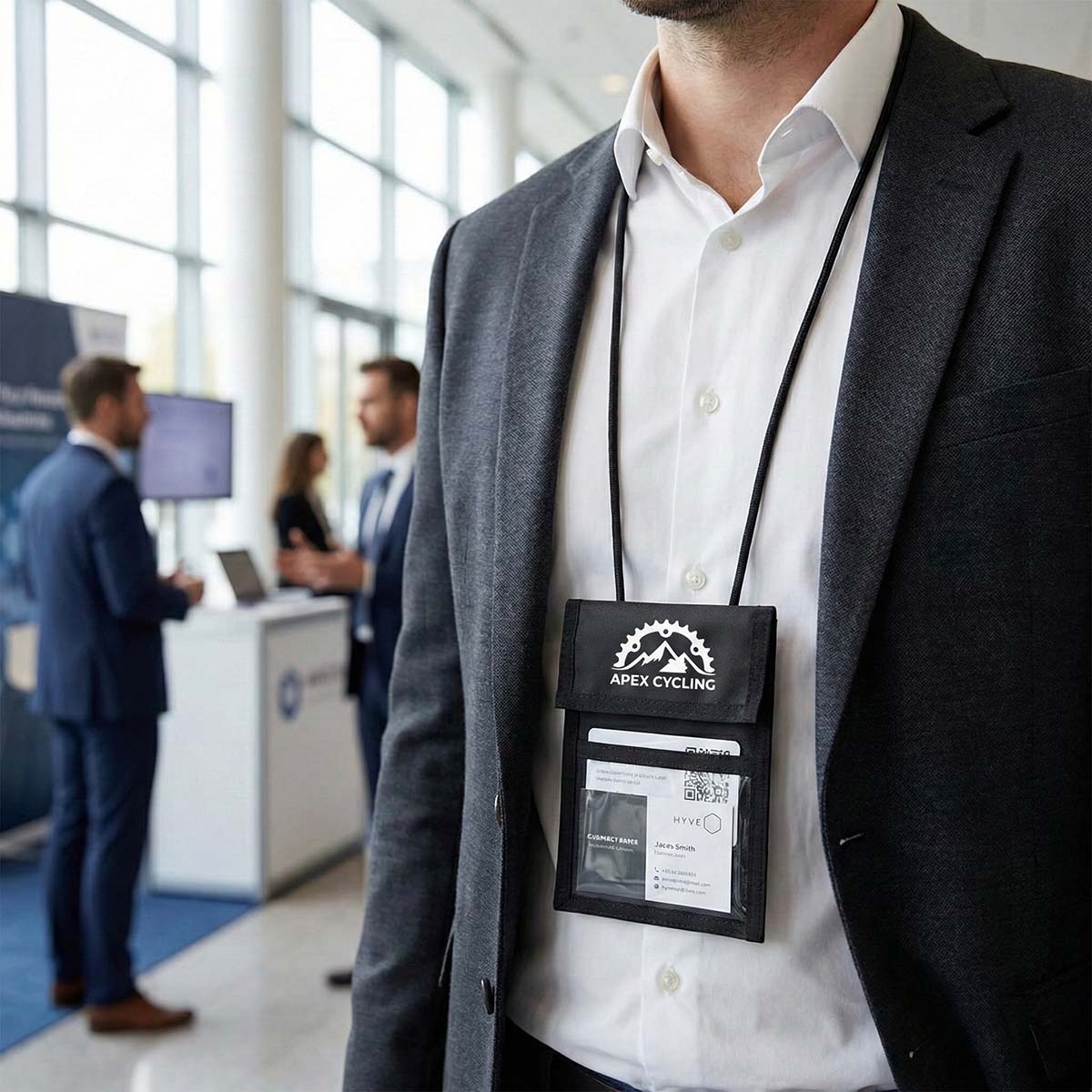 Corporate gifts: Nylon neck wallet badge holders with clear window. ID badge neck pouches with pen holders. 5 colors for events and conferences.