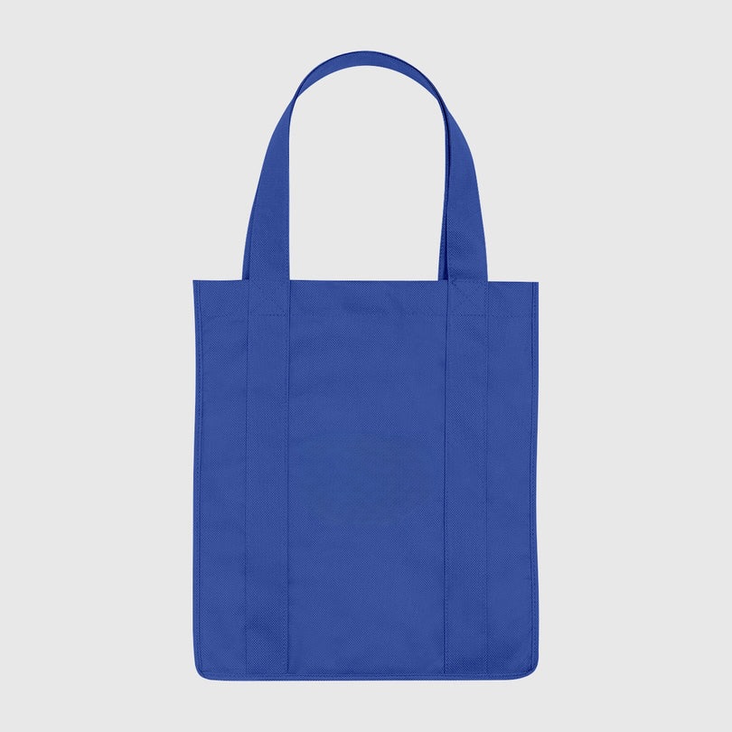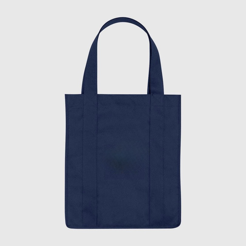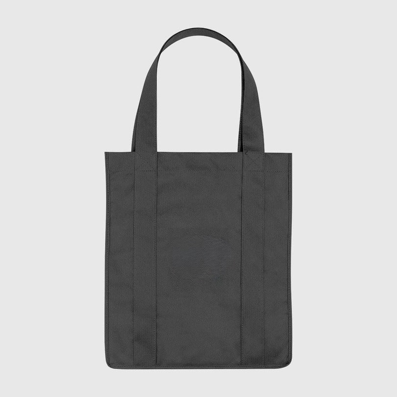 Corporate gifts: Non-woven shopper tote bags with water resistant coating. Reusable grocery totes with 10 inch gusset. 20 inch handles in 3 colors.