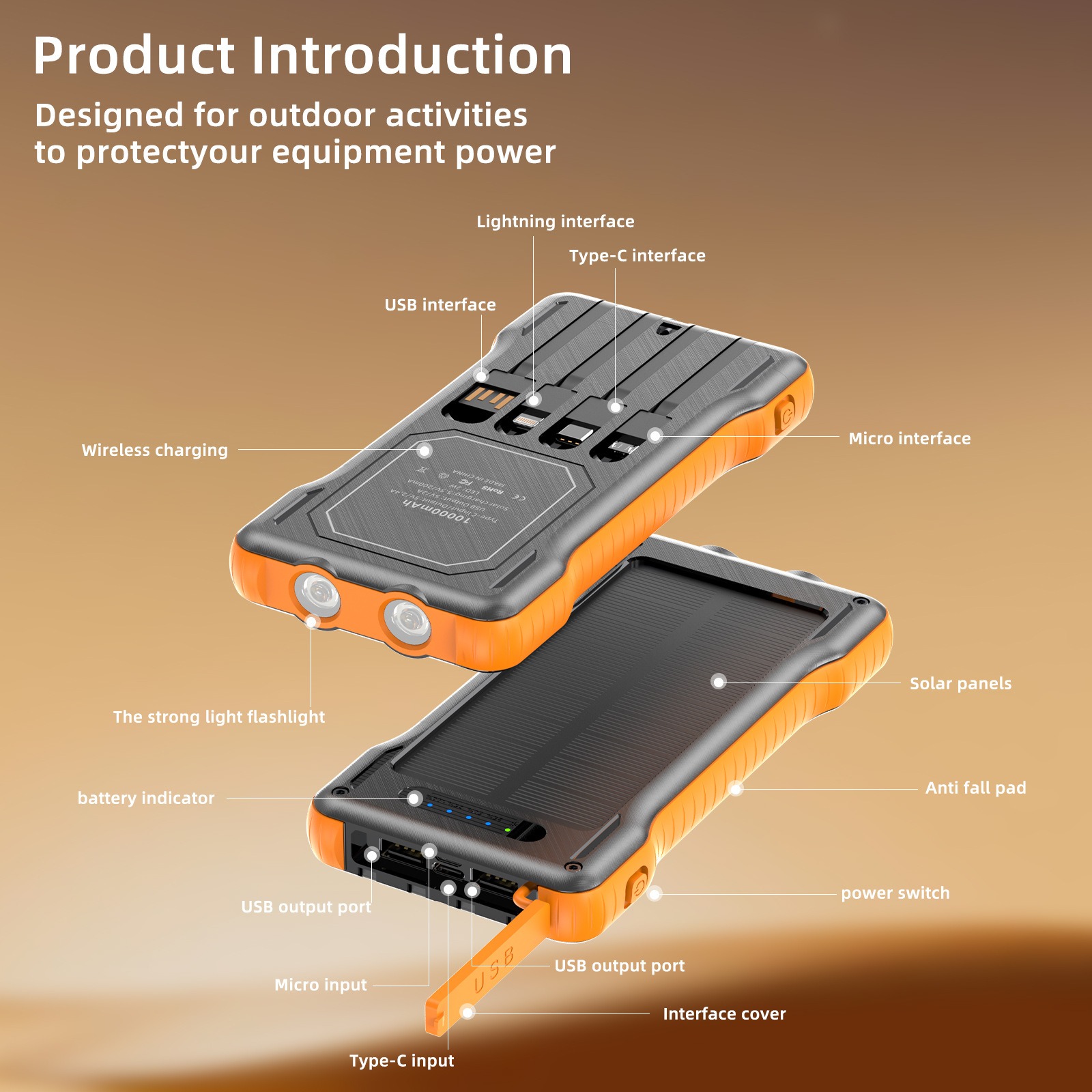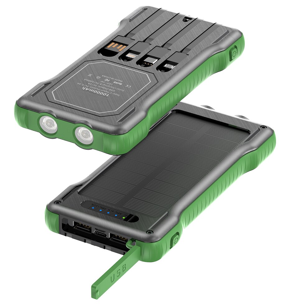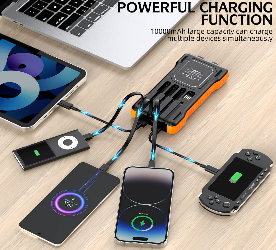 The Solar Power Bank with Built‑in Cables is a 10,000mAh outdoor‑ready charger made from ABS plastic and silicone. It includes four integrated charging cables, dual USB outputs, multiple input ports and an LED torch with SOS mode, allowing users to power up to five devices at once making is ideal for travel, events and emergency use in Hong Kong.